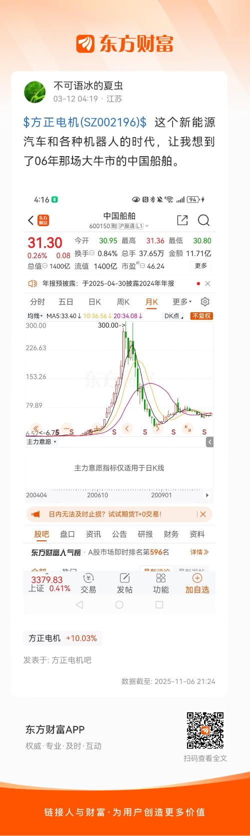 $方正电机(SZ002196)$  这个新能源汽车和各种机器人的时代,让我想到了06年那场大牛市的中国船舶。