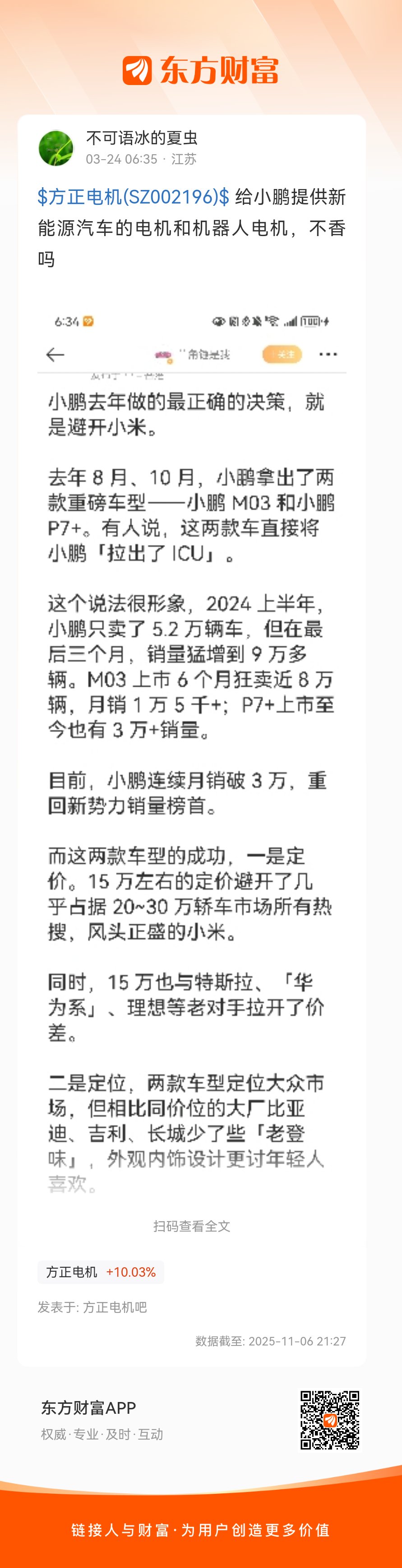 $方正电机(SZ002196)$ 小鹏提供新能源汽车的电机和机器人电机,不香吗