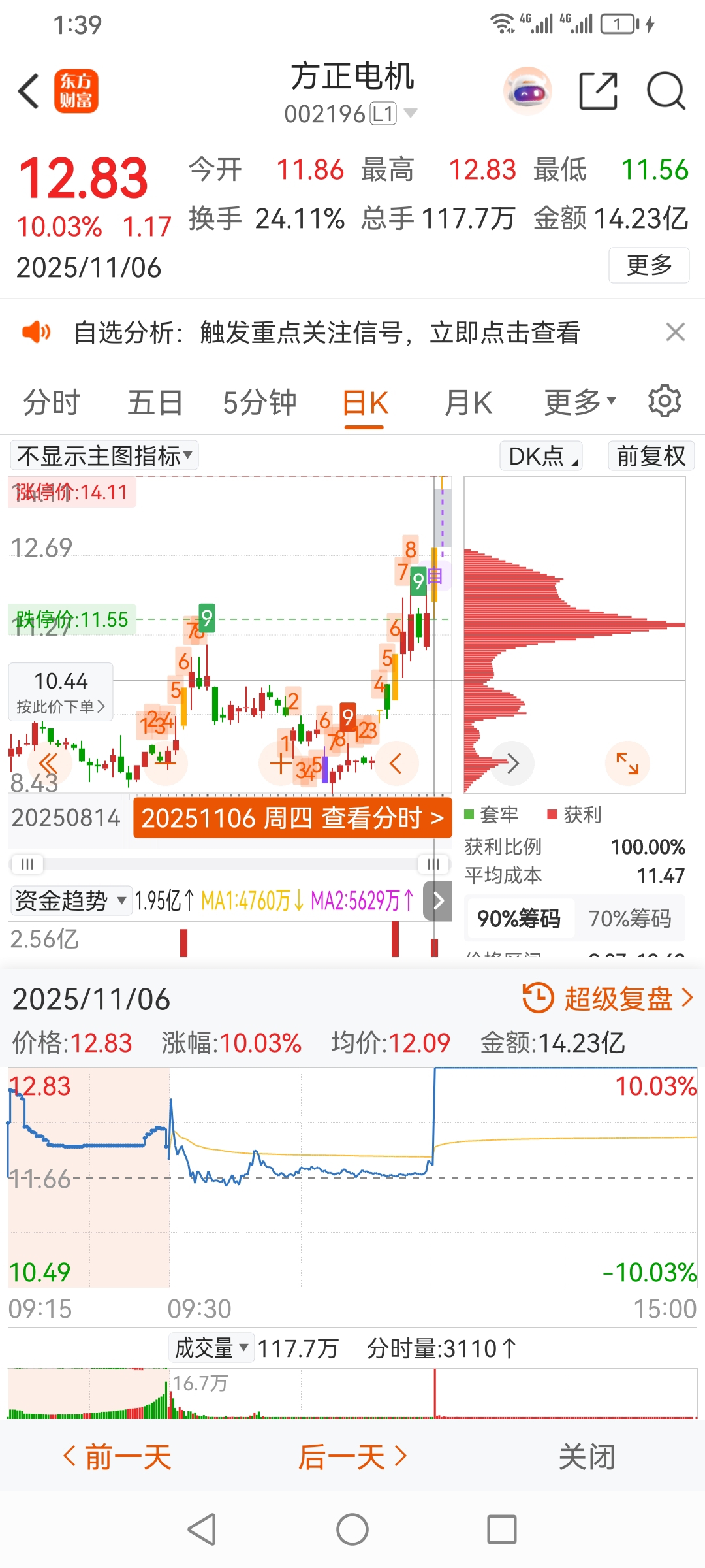 军哥昨日今天继续方正电机,情绪启动期,买进半仓。