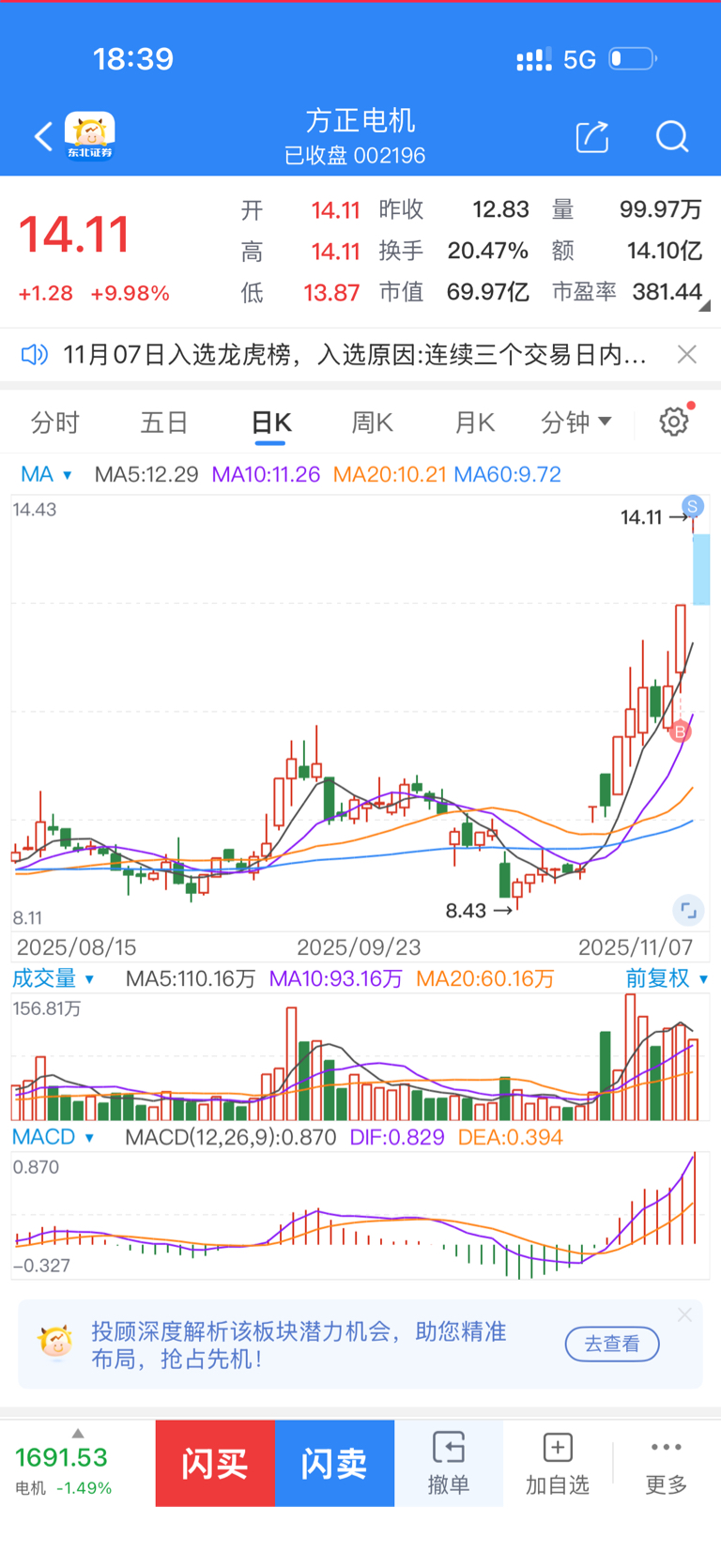 $方正电机(SZ002196)$ 赚了19个点走了!