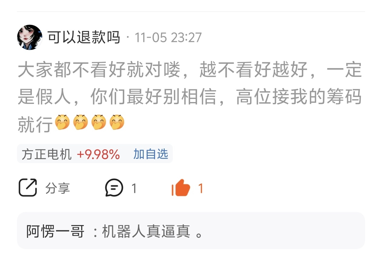 $方正电机(SZ002196)$ 两天前,说里是真人的那一群傻蛋,今天应该都追进来了,今天涨停板已经全部清仓,周一去吧,小鹏美股大跌