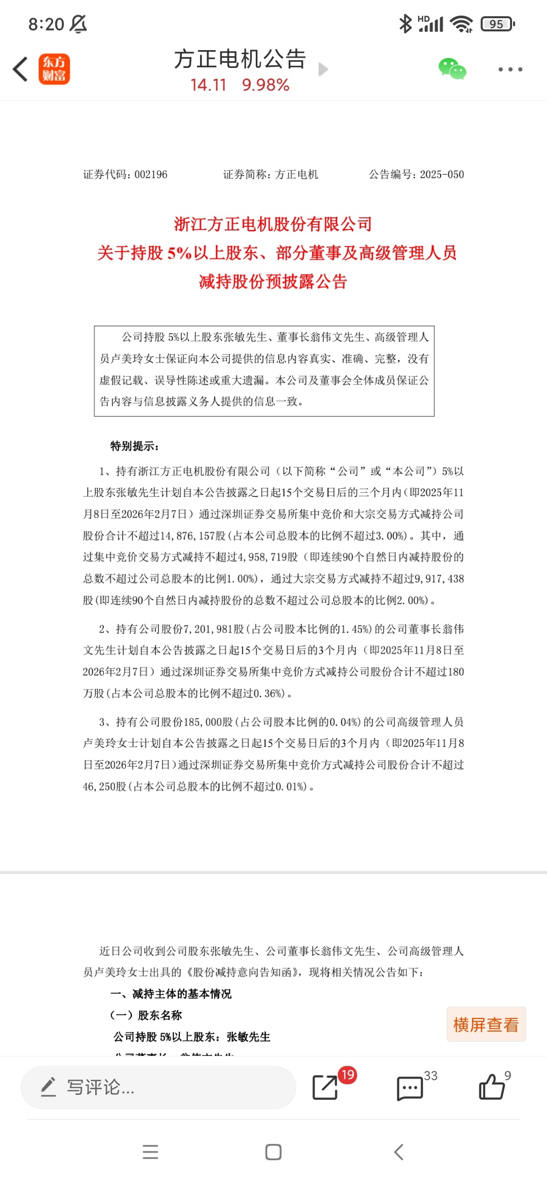 $方正电机(SZ002196)$ 股东、高管减持下周一就开始了,减持方式:大宗交易和集合竞价。下周一能一字板?想多了吧,有人涨停价接盘,你看多好!