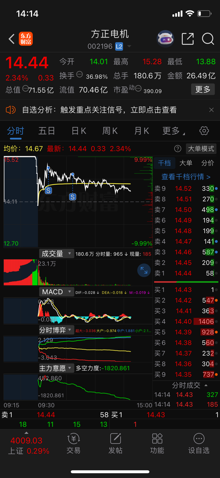 $方正电机(SZ002196)$ 爆量分歧出局观望