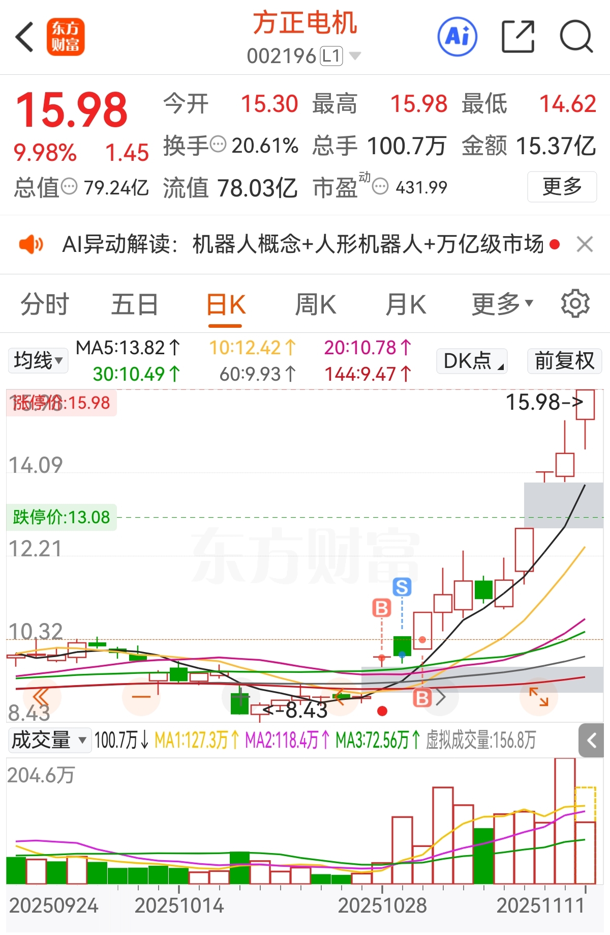 $方正电机(SZ002196)$ 我这样的散户最好对付,不走,盈利也不走,没有抛压。