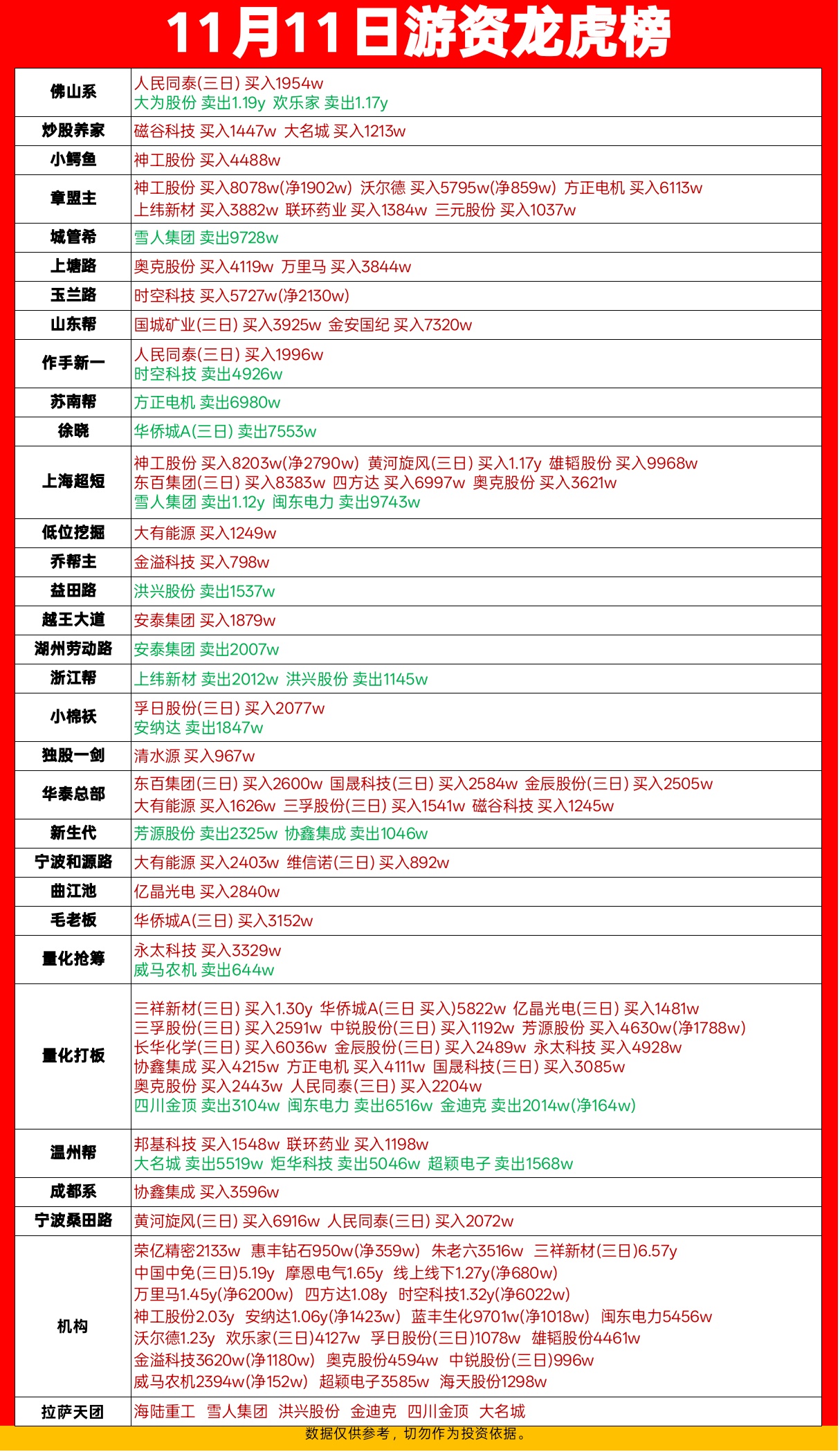 11.11游资龙虎榜,佛山系上塘路章盟主上榜。