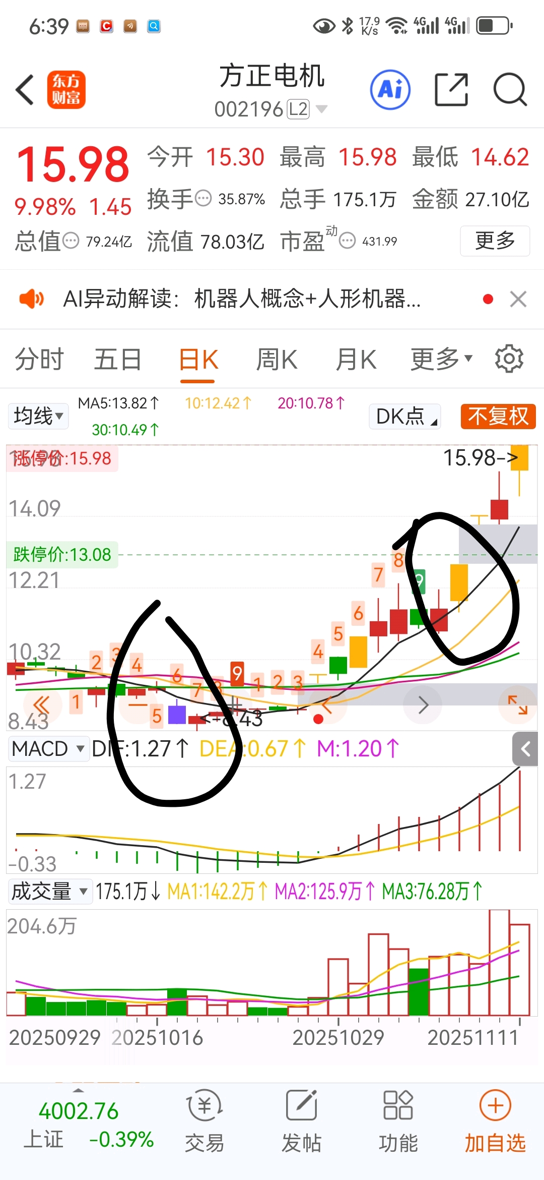 $方正电机(SZ002196)$ 问下各位,紫色和黄色 柱。代表什么????