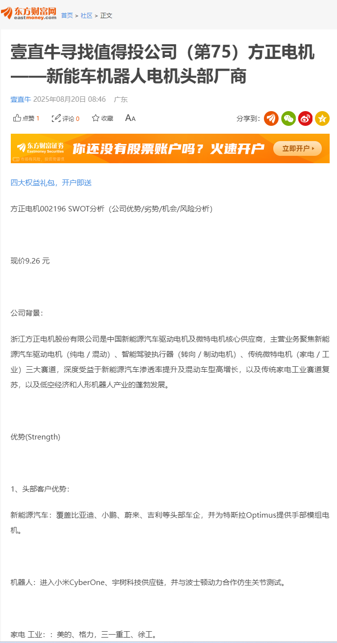 8月20日分析分享时价格是9.5左右,今年3月份参观深圳国际消费电子展时发现高速电机在消费电子产品的应用非常广泛,后来就开始关注分析方正电机/卧龙电驱/大洋电机/江特电机/信质等行业公司