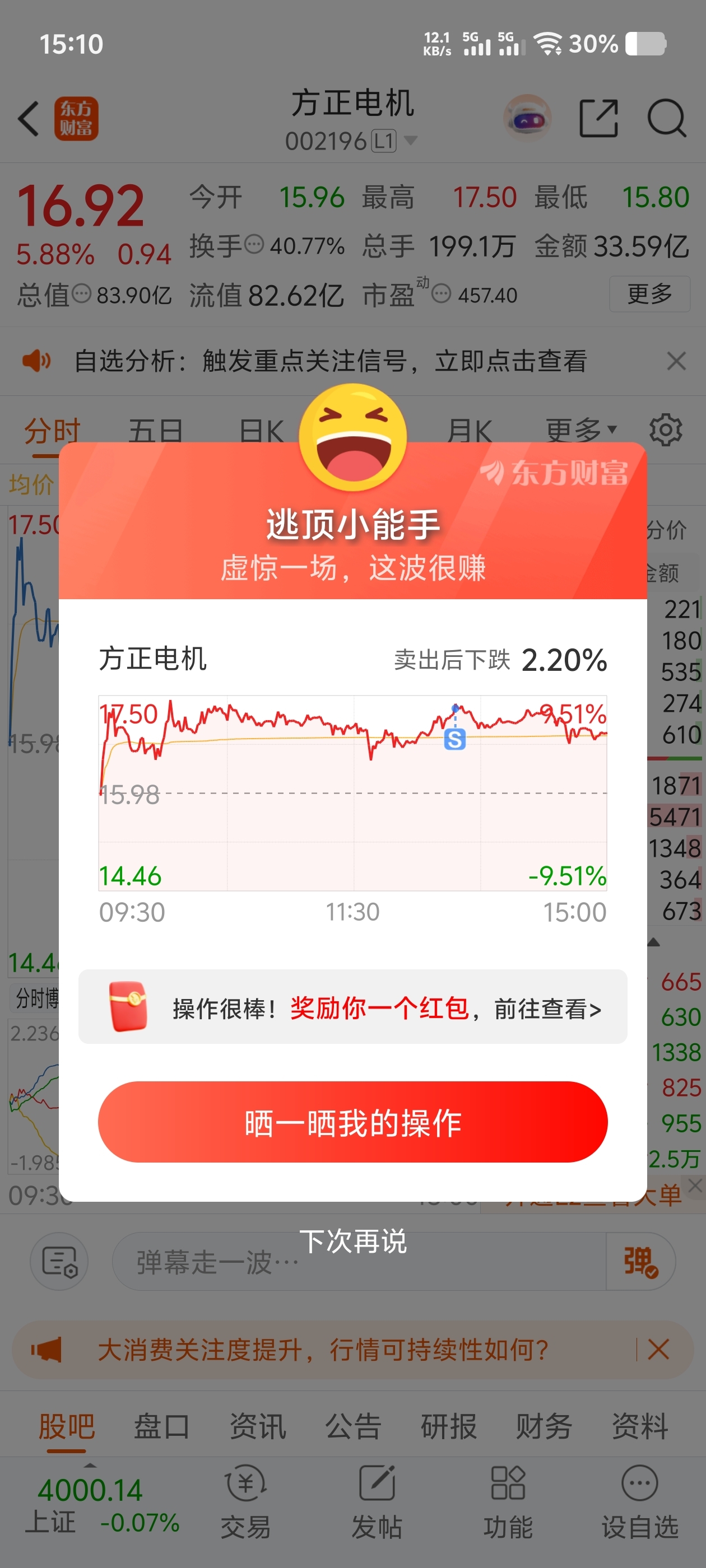 $方正电机(SZ002196)$ 感觉不会涨停,跑路了