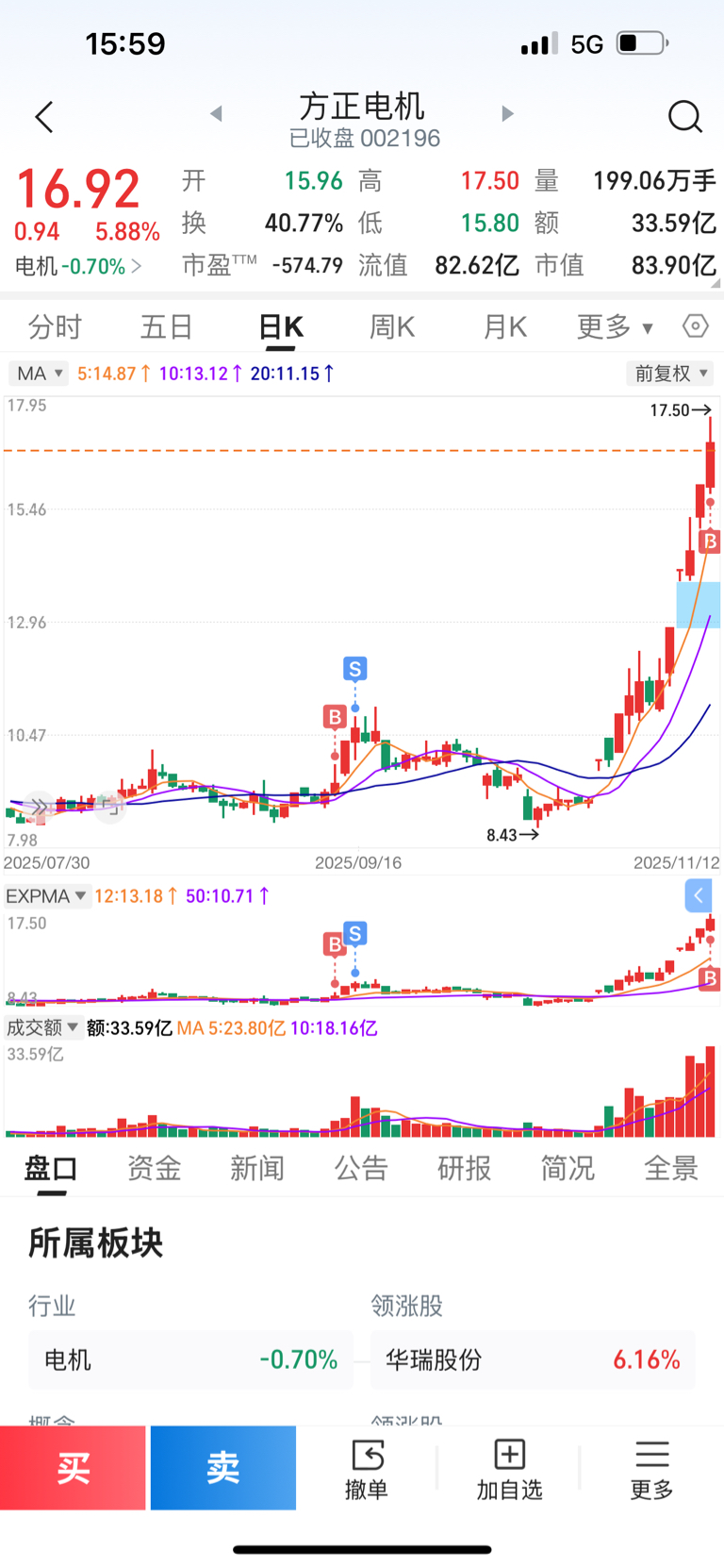 $方正电机(SZ002196)$ 今天在最高位置进去,明天会有溢价吗