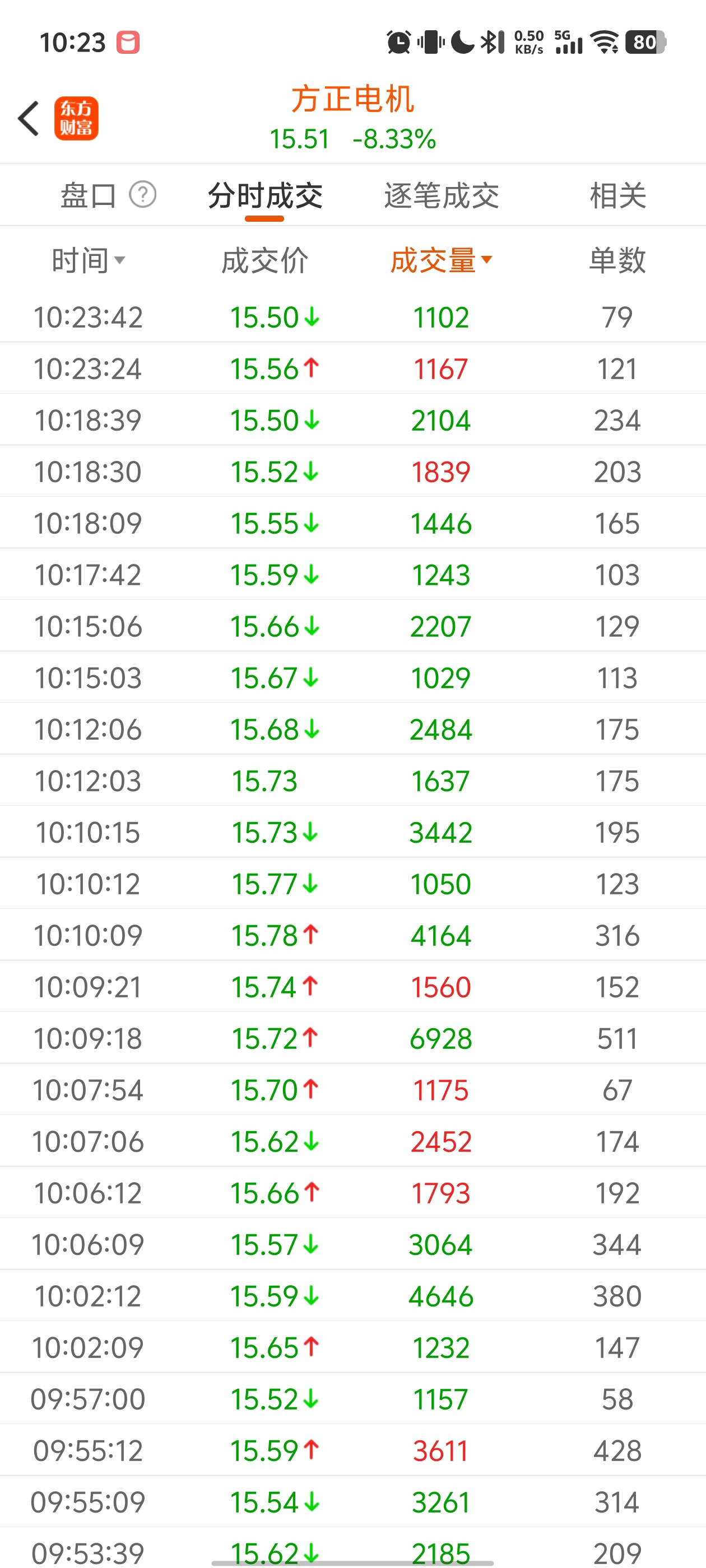 $方正电机(SZ002196)$ 1000手以上的单,大单砸,散户进,勉强维持不跌停……