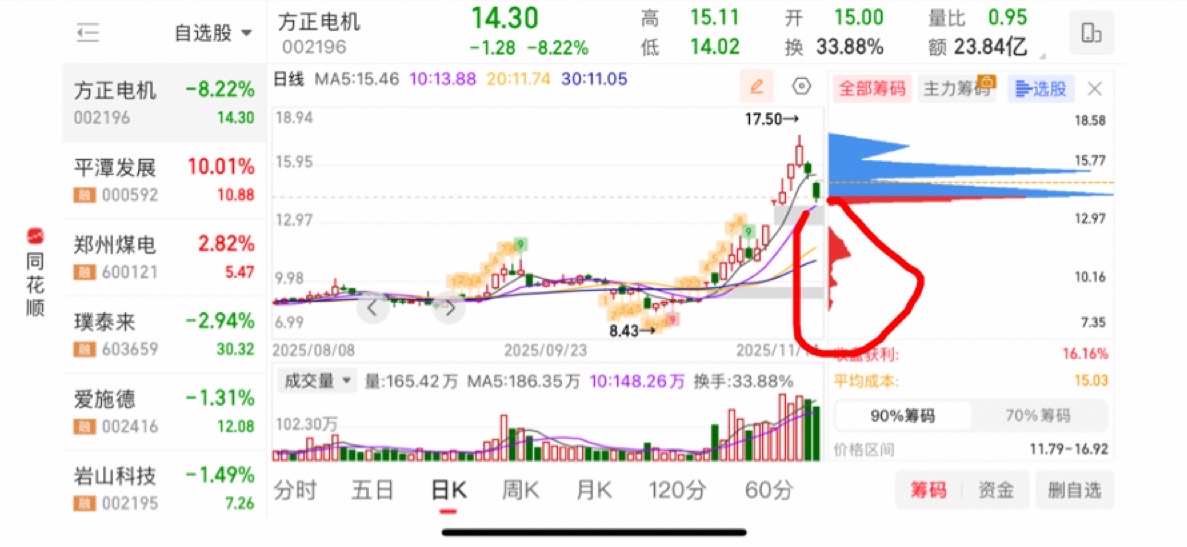 $方正电机(SZ002196)$ 这几天筹码峰全部跑完了,全都给挂树上了,还在这叫反包,好股能连续两个跌停么