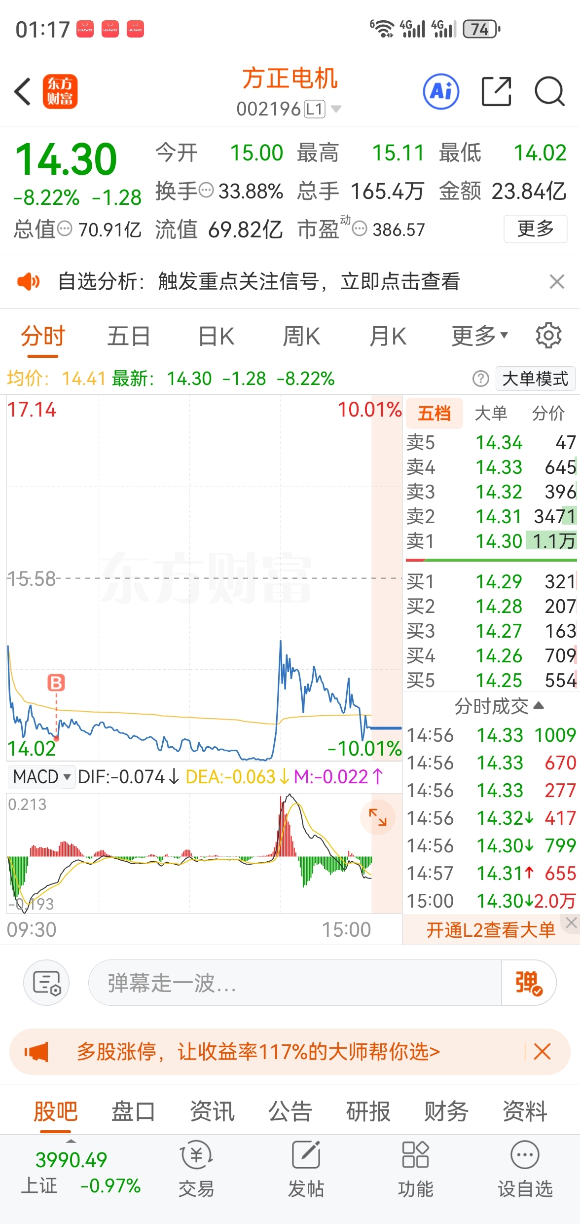 $方正电机(SZ002196)$ 兄弟们不要慌,全仓,今天本来反包是必然的,可惜没有上午启动,下午启动刚好遇到大盘一路下杀,多头最后停手了,我相信多头停手并不是放弃,后续必有更大的动作。