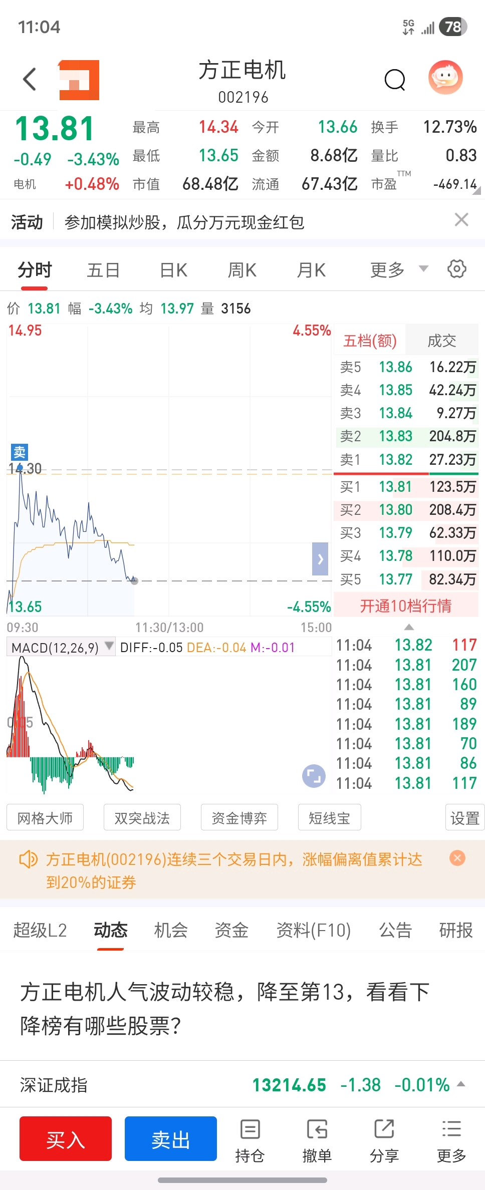 $方正电机(SZ002196)$ 拿到现在得亏5万多 感谢主力给个体面。