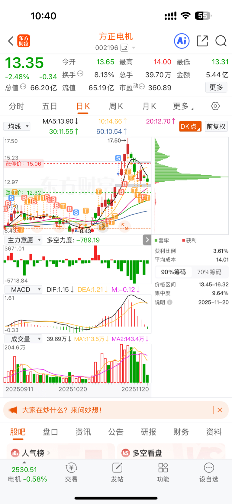 $方正电机(SZ002196)$ 底部筹码彻底跑光