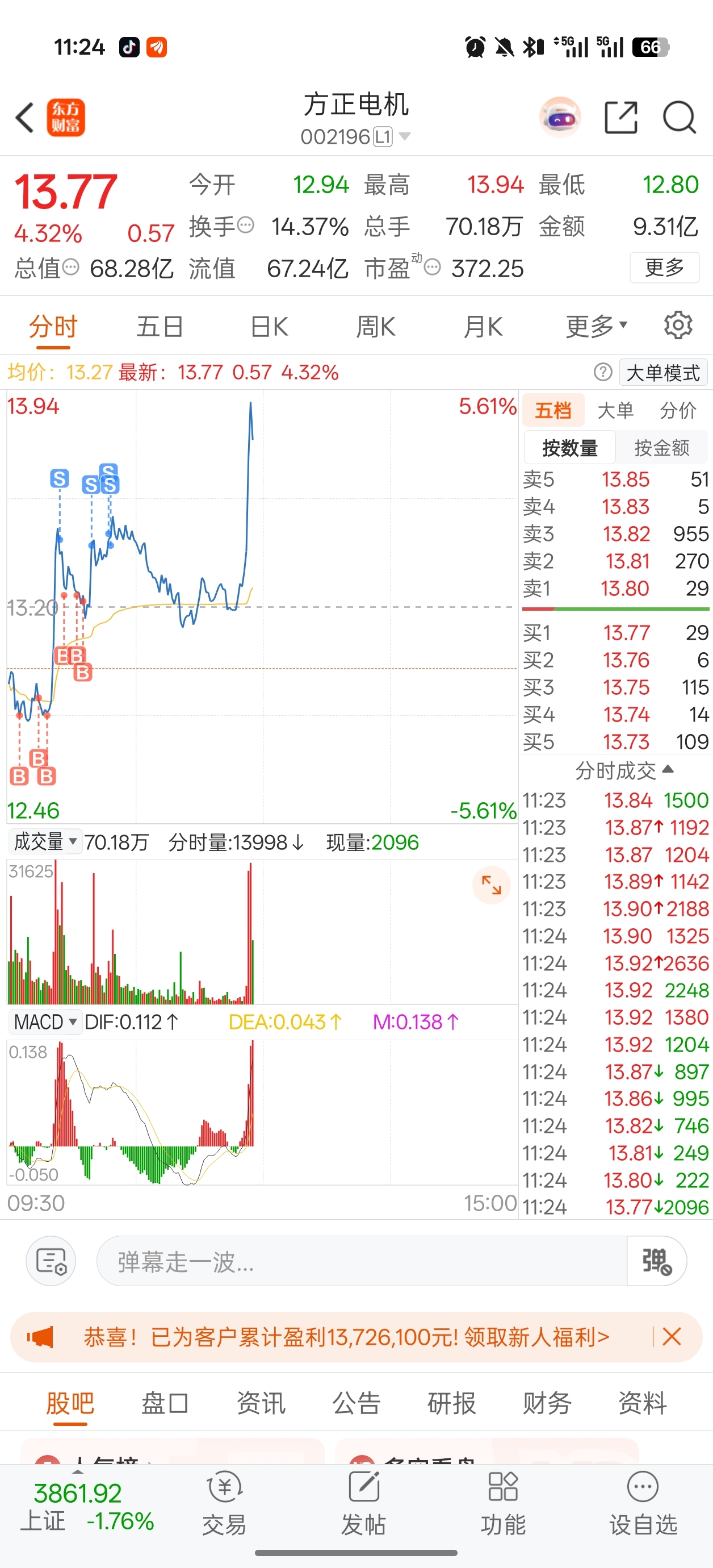 $方正电机(SZ002196)$ 后悔了,刚刚下来应该再加3笔就好了,哎