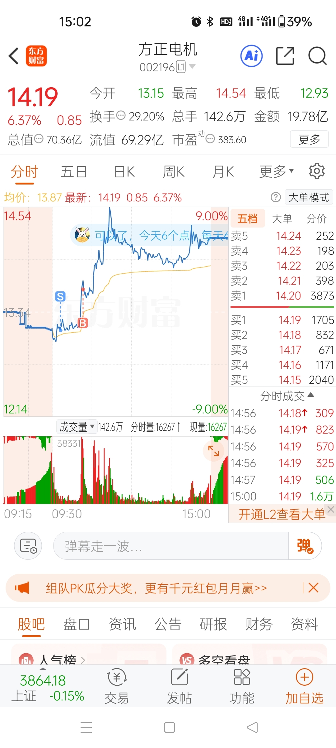 $方正电机(SZ002196)$ 今天做了3个点的T,还可以