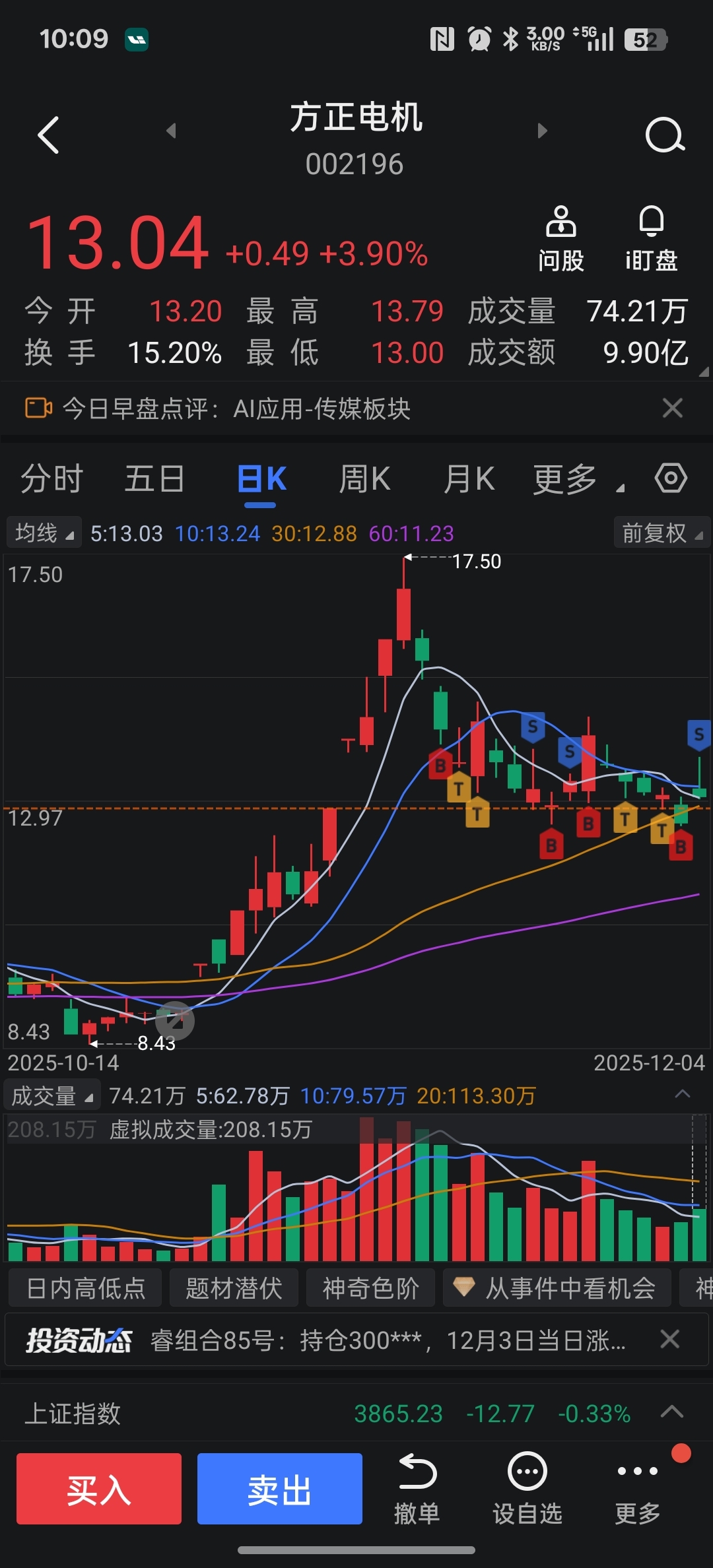 $方正电机(SZ002196)$ 只要不割肉清仓,总会回本的,方正拿了一个月了,每天t一t,今天回本走了,13.15出了,也许不会回来了