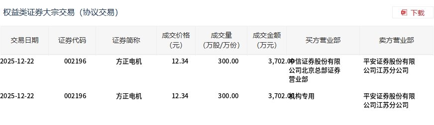 方正电机今日大宗交易折价成交600万股,成交额7404万元