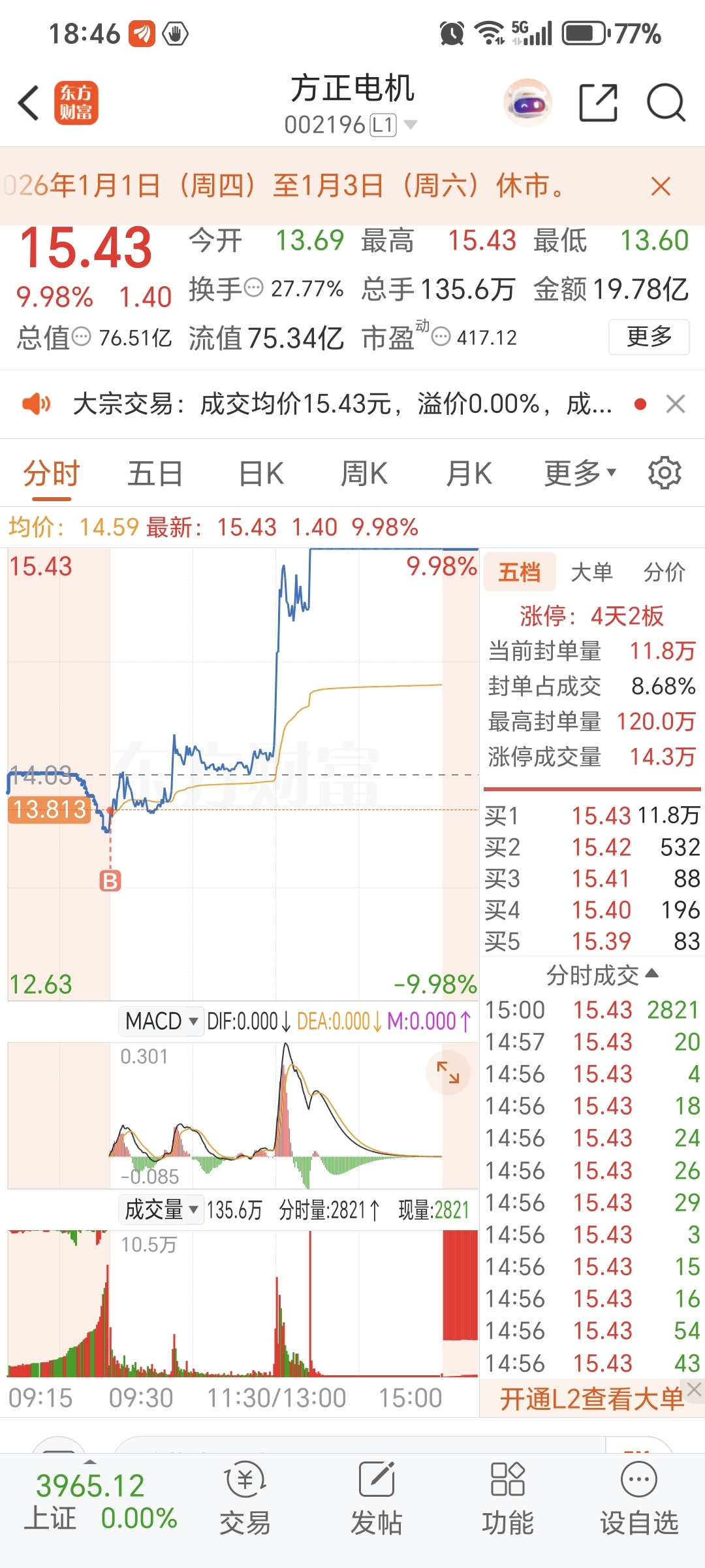 $方正电机(SZ002196)$ 明天不用卖,还有一天