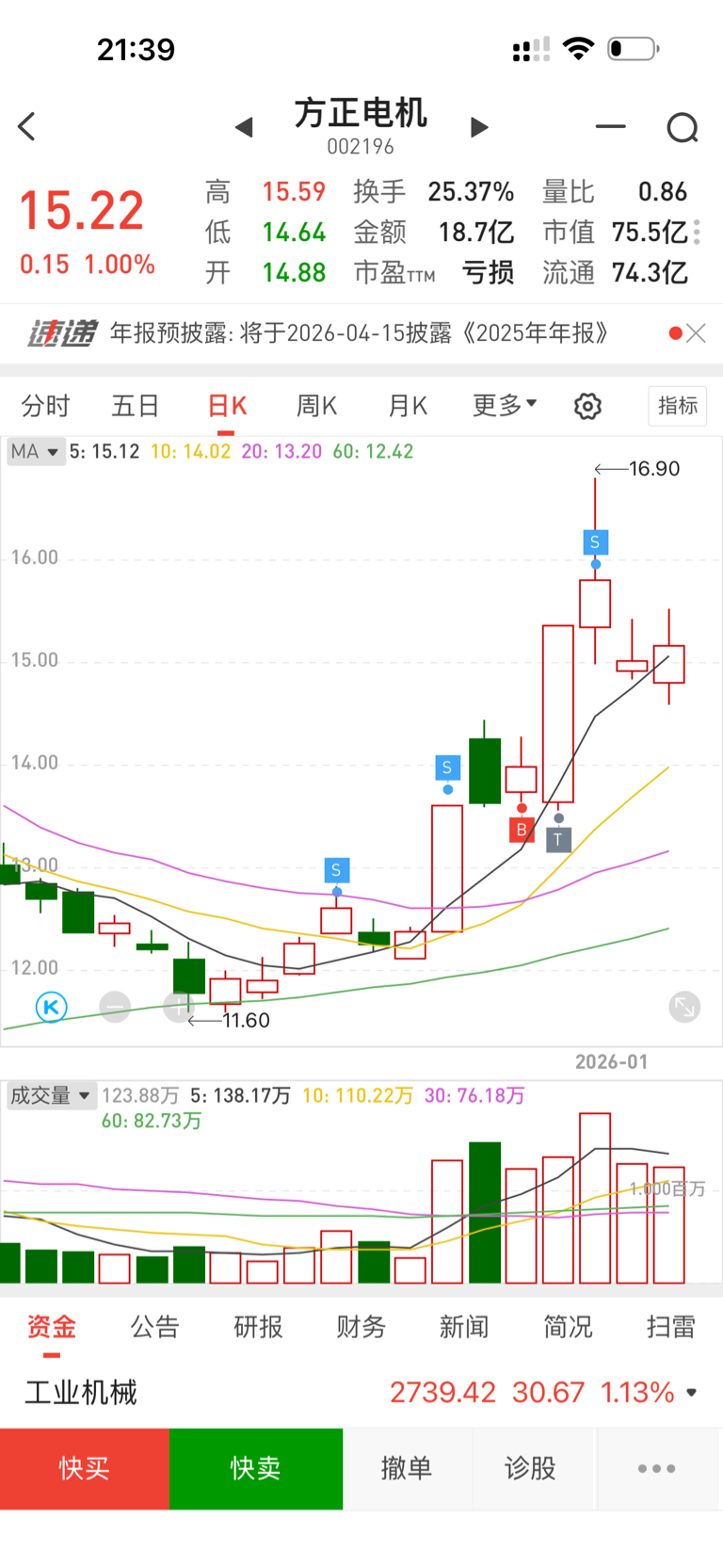 $方正电机(SZ002196)$ 从12.25那天开始到今天,这成交量说明行情已经启动了,咋还有人看空呢?咋不反思自己水平不行呢?今天上午跌到14.68我又重新买入,10点多跌到15我又买入,当天浮盈2.6%
