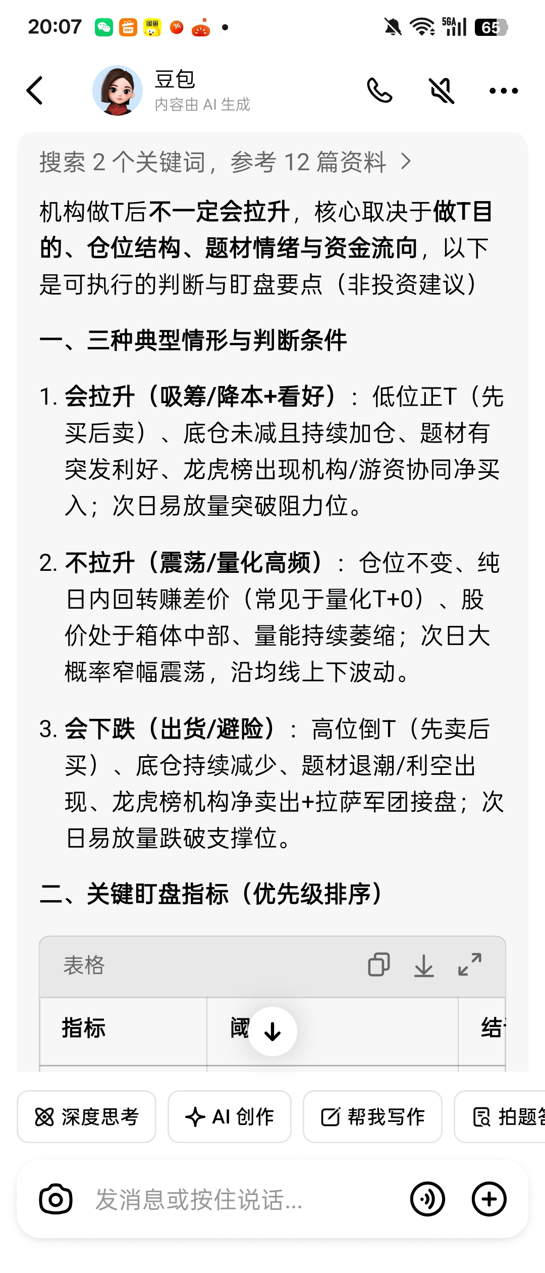 机构做T,这属于高位倒T么,豆包说的意思是出货的意思么?难道危险了?谁会看盘,来