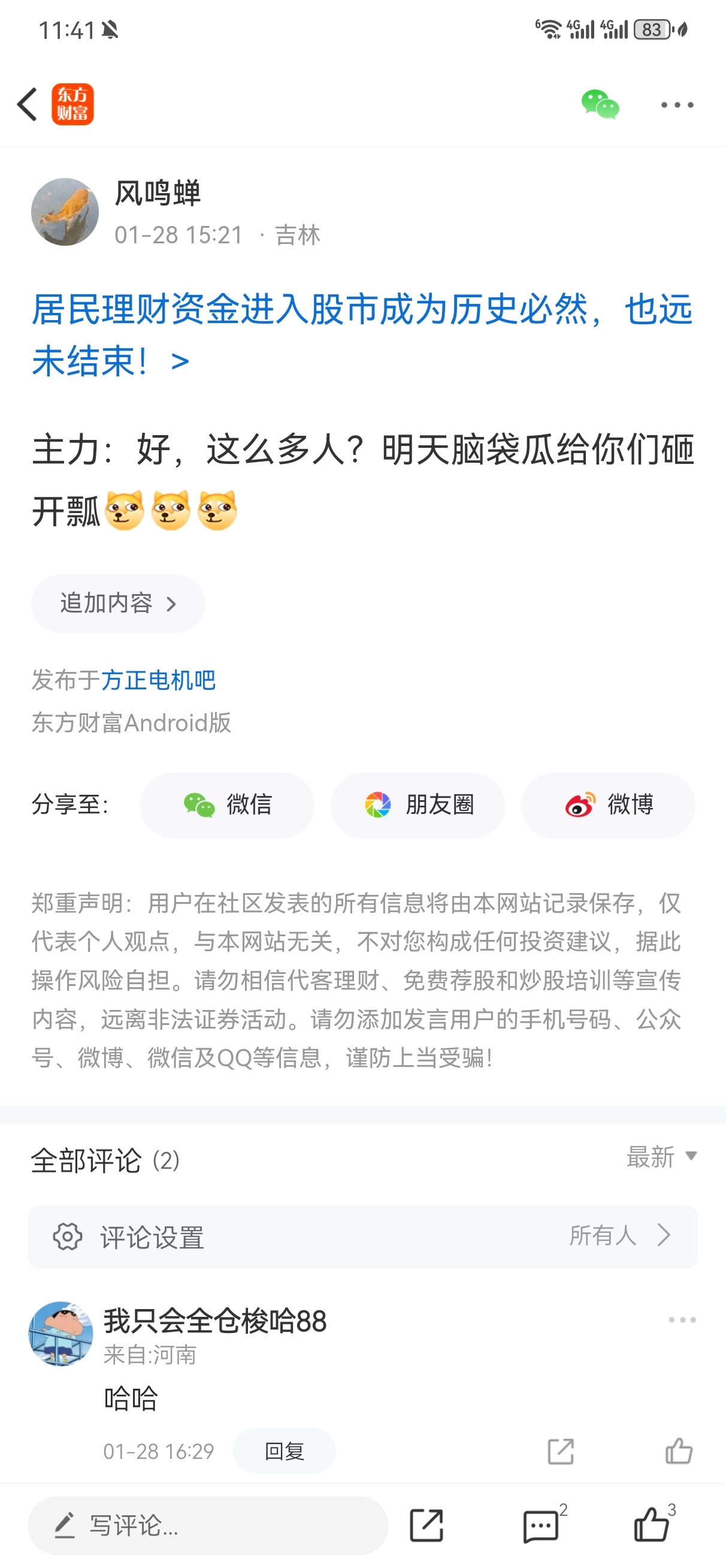温馨提示: 1.根据《证券法》规定,禁止编造、传播虚假信息或者误导性信息,扰乱证券市场;2.用户在本社区发表的所有资料、言论等仅代表个人观点,与本网站立场无关,不对您构成任何投资建议。用户应基于自己的独立判断,自行决定证券投资并承担相应风险。《东方财富社区管理规定》