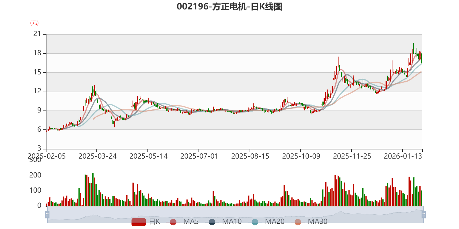 中证智能财讯方正电机(002196)1月29日晚间披露2025年度业绩预告,预计2025年实现营业收入29亿元至29.6亿元;归母净利润1800万元至2700万元,上年同期亏损2834.53万元;扣非净利润预计1700万元至2500万元,上年同期亏损3866.46万元;基本每股收益0.0363元/股-0.0544元/股。以1月29日收盘价计算,方正电机目前市盈率(TTM)约为302.67倍-454倍,市净率(LF)约5.77倍,市销率(TTM)约2.79倍。