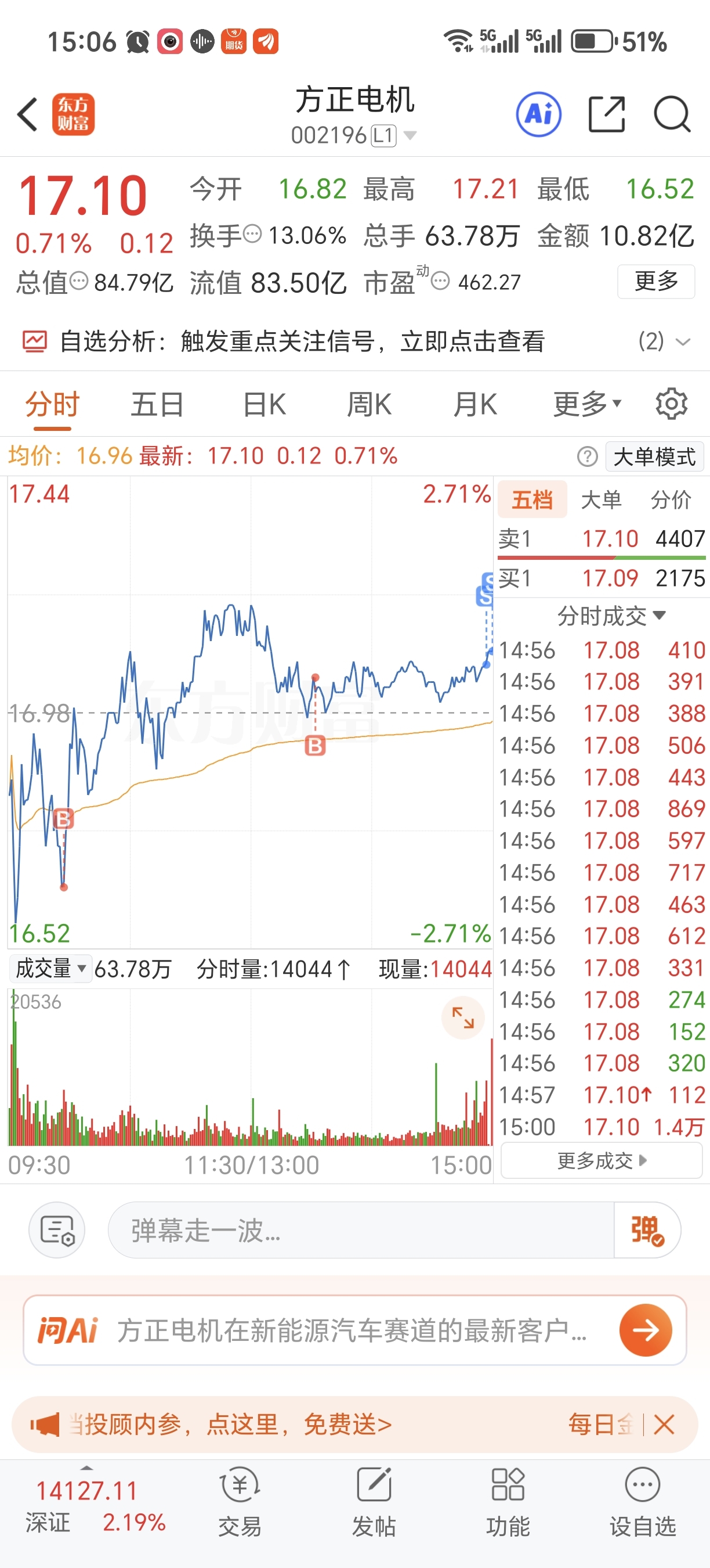 $方正电机(SZ002196)$ 方正本色出演。但 今天比跌了还难受,大盘,板块涨了多少,它就差没绿了,走一半再说。