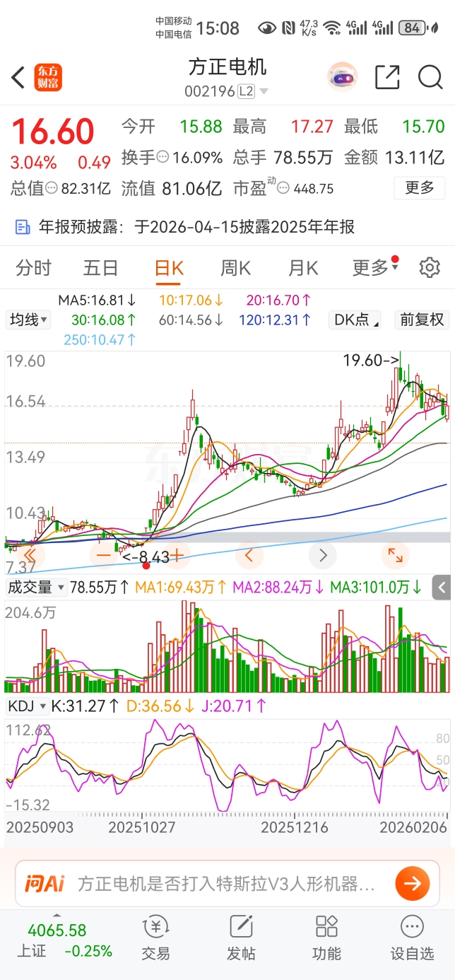 $方正电机(SZ002196)$ 这几天没有做T,还加了点仓,导致成本线上移了,年前不打算操作了,就这样吧