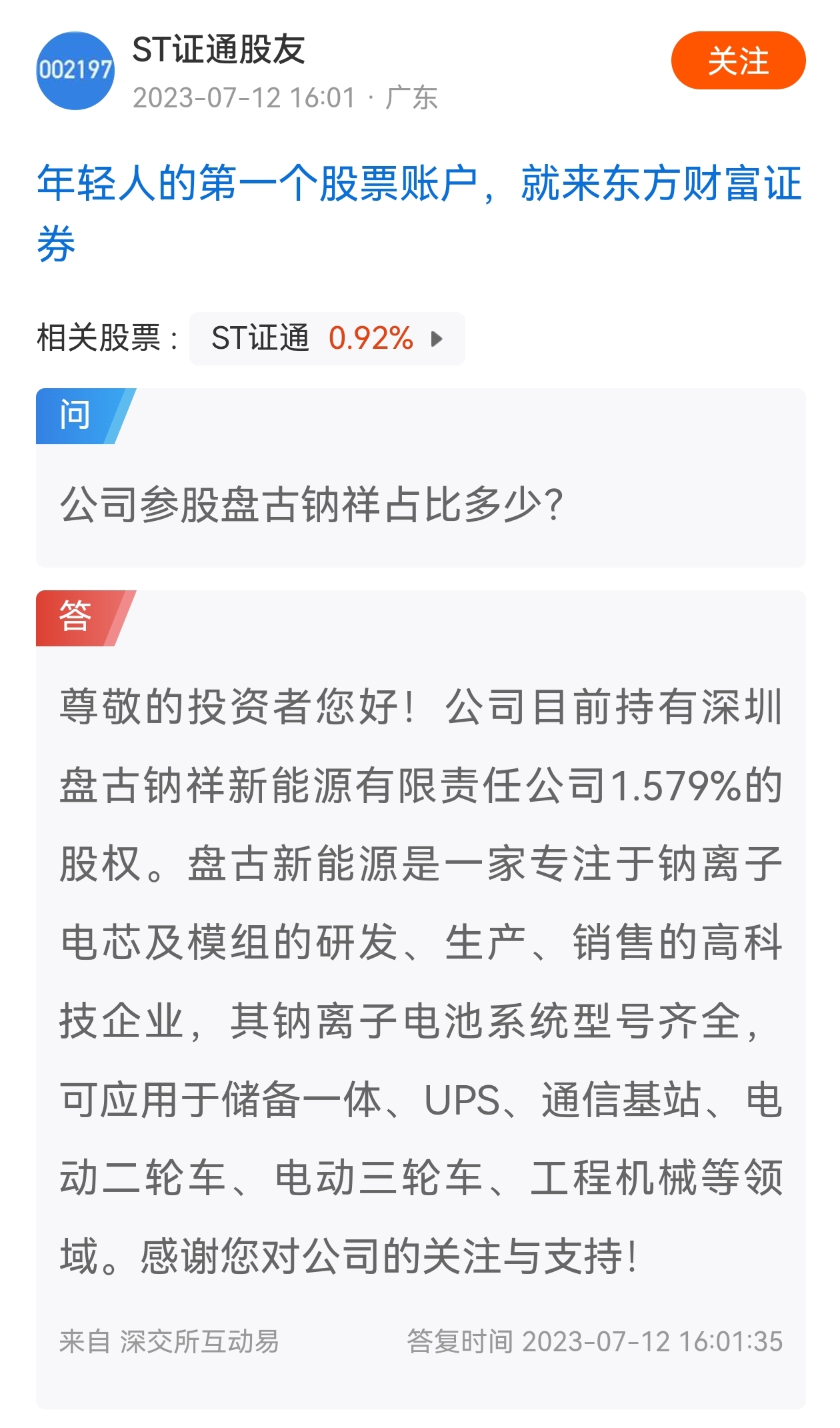 $ST证通(SZ002197)$ - 投资钠离子电池企业:2023年6月,证通电子参与了深圳盘古钠祥新能源有限责任公司的天使轮投资。盘古钠祥是一家专注于钠离子电池电芯及模组研发、生产和销售的高科技企业。证通电子的此次投资使其能够接触钠离子电池产业链的核心技术和资源,为自身业务探索更经济、可靠的储能解决方案。截至2025年9月,盘古钠祥官网仍将证通电子列为股东之一。