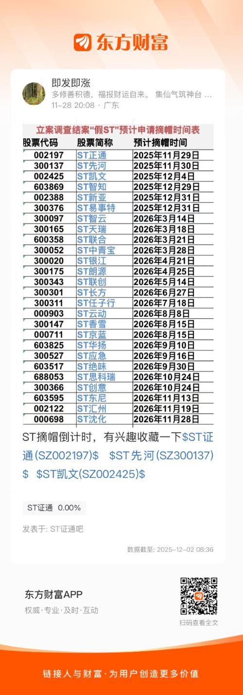 ST摘帽倒计时,有兴趣收藏一下$ST证通(SZ002197)$ $ST先河(SZ300137)$ $ST凯文(SZ002425)$