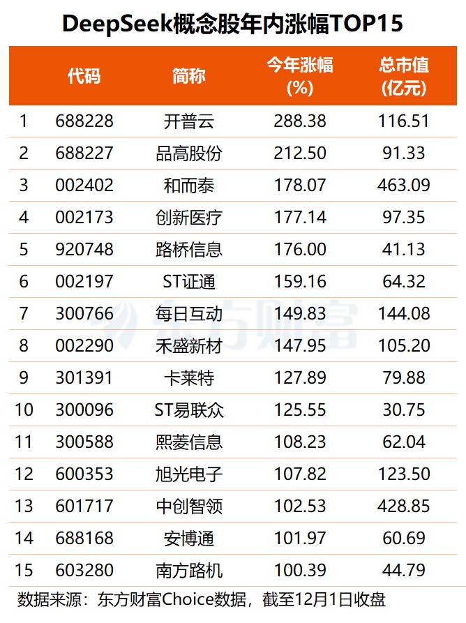 超八成DeepSeek概念股年内股价上涨,平均涨幅约30.67%。其中,开普云以288.38%的涨幅领涨概念板块,品高股份年内也涨超2倍,和而泰、路桥信息、每日互动、旭光电子等13股年内涨幅均在100%至200%之间。