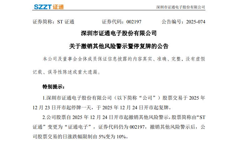 12月22日晚间,ST证通(002197)公告,公司股票将于12月23日开市起停牌一天,12月24日开市起复牌并撤销其他风险警示,股票简称由“ST证通”变更为“证通电子”,日涨跌幅限制由5%变为10%。