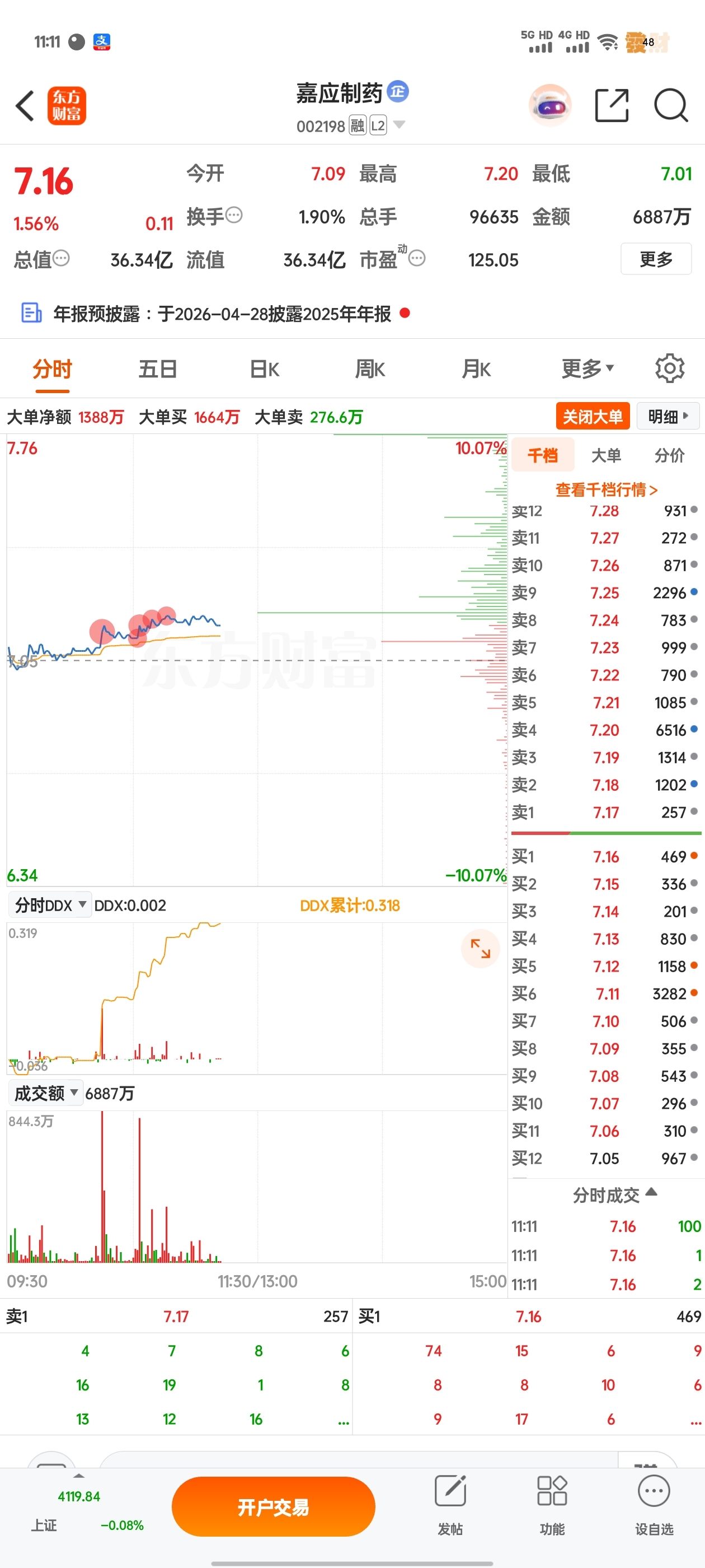 $嘉应制药(SZ002198)$ 虽然显示 有大资金 进入,但是我观察了 好久 这个股的尿性,我走了!虽然下午 可能涨停,但是我忍不了这么磨叽!