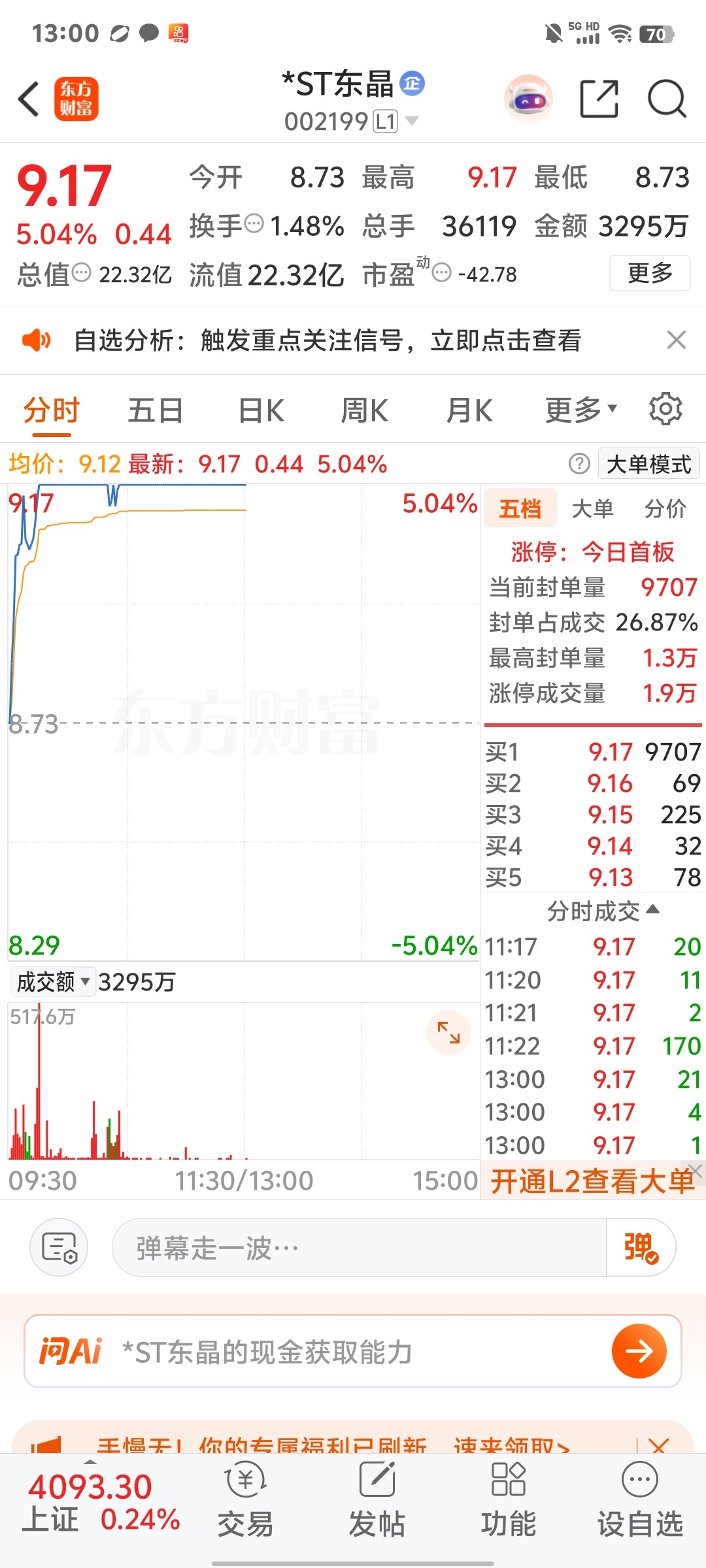 $*ST东晶(SZ002199)$ 上午收盘11.22到11.30,8分钟一手没人卖,这是要连板吗?