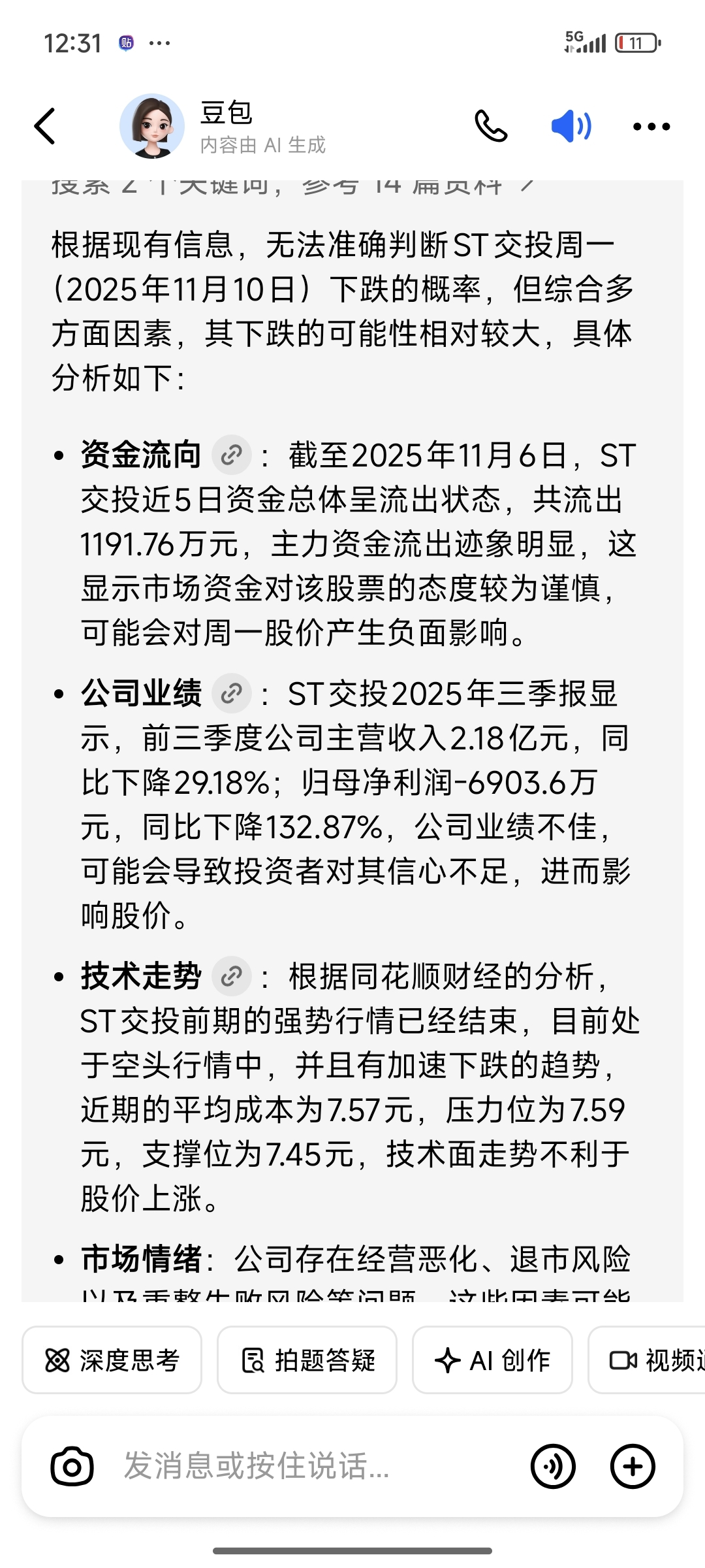 $*ST交投(SZ002200)$ 这下完了ai豆包都觉得跌的概率大