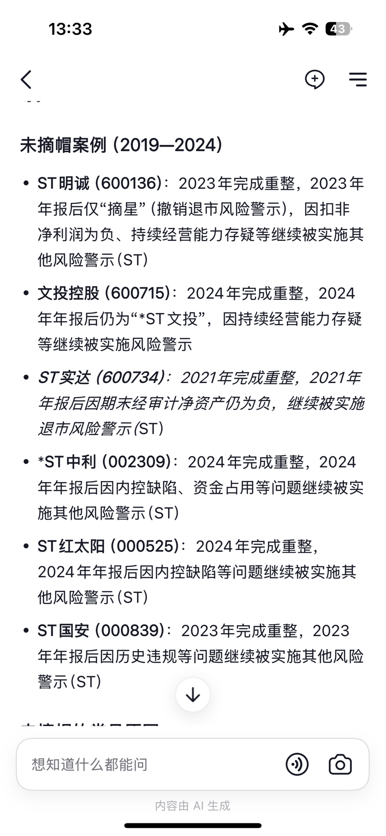 另外自己去搜搜多少重整后当年一样退市的!真是无知者无畏!真摘帽已经开始涨了也没怎么跌,这个一直跌