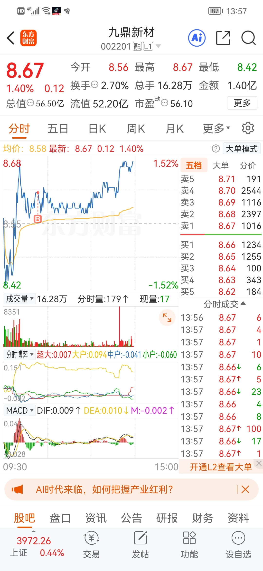 $九鼎新材(SZ002201)$  今天收盘价在8.70-8.75附近