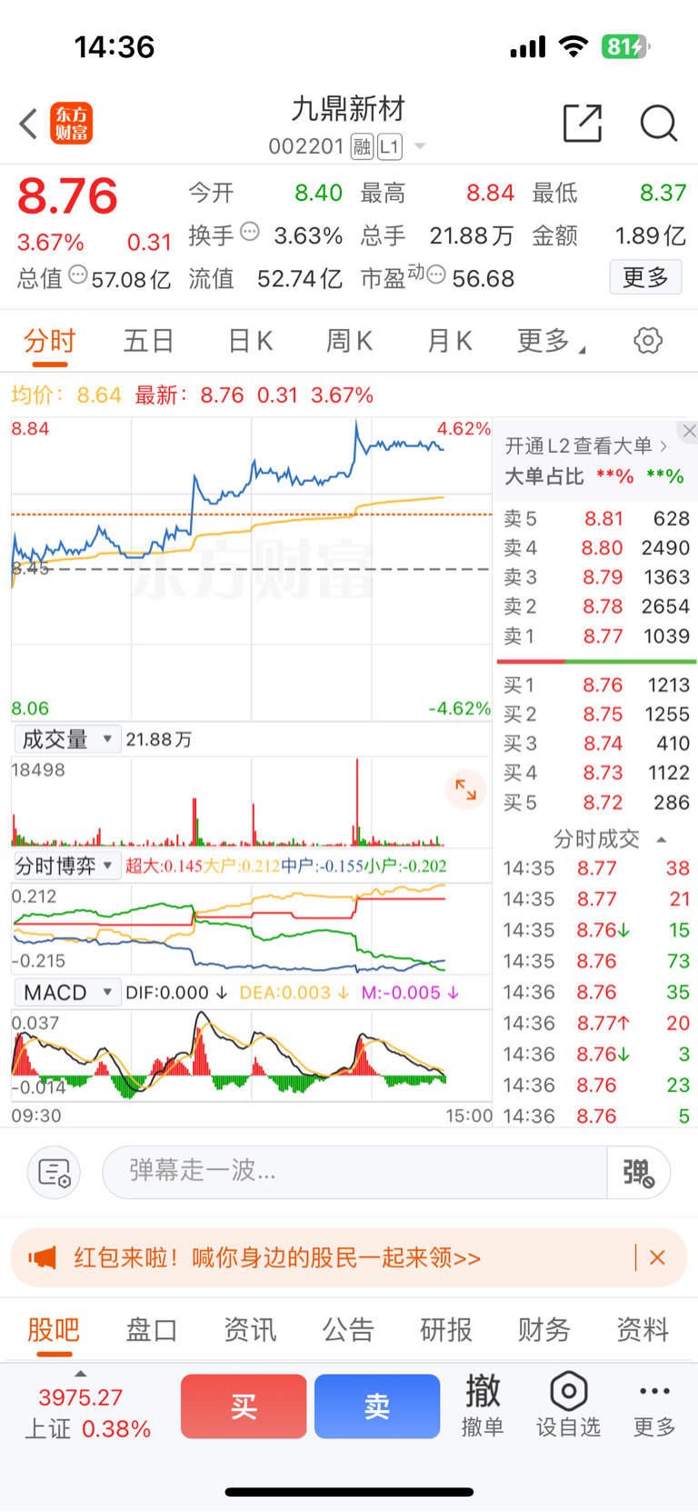 $九鼎新材(SZ002201)$ 现在8.76,收盘前还有一次拉升,慢慢看会拉多少