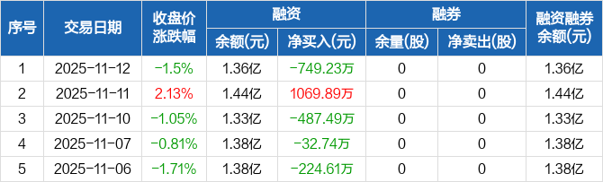 九鼎新材:融资净偿还749.23万元,融资余额1.36亿元(11-12)