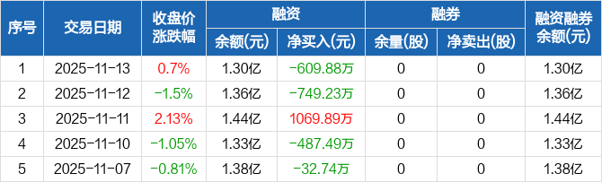 九鼎新材:融资净偿还609.88万元,融资余额1.3亿元(11-13)