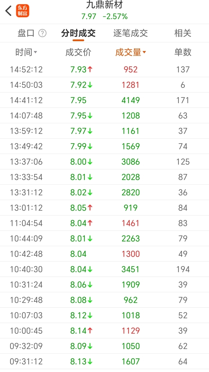 $九鼎新材(SZ002201)$ 主导今天价格走向的三万多手