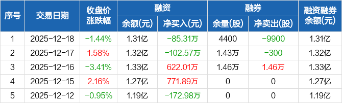 九鼎新材:融资净偿还85.31万元,融资余额1.31亿元(12-18)