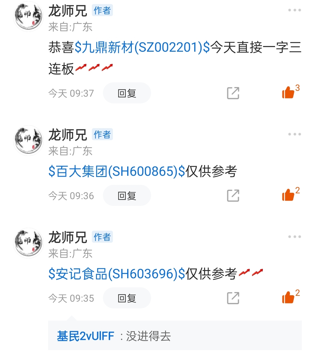 $九鼎新材(SZ002201)$ $百大集团(SH600865)$ $安记食品(SH603696)$