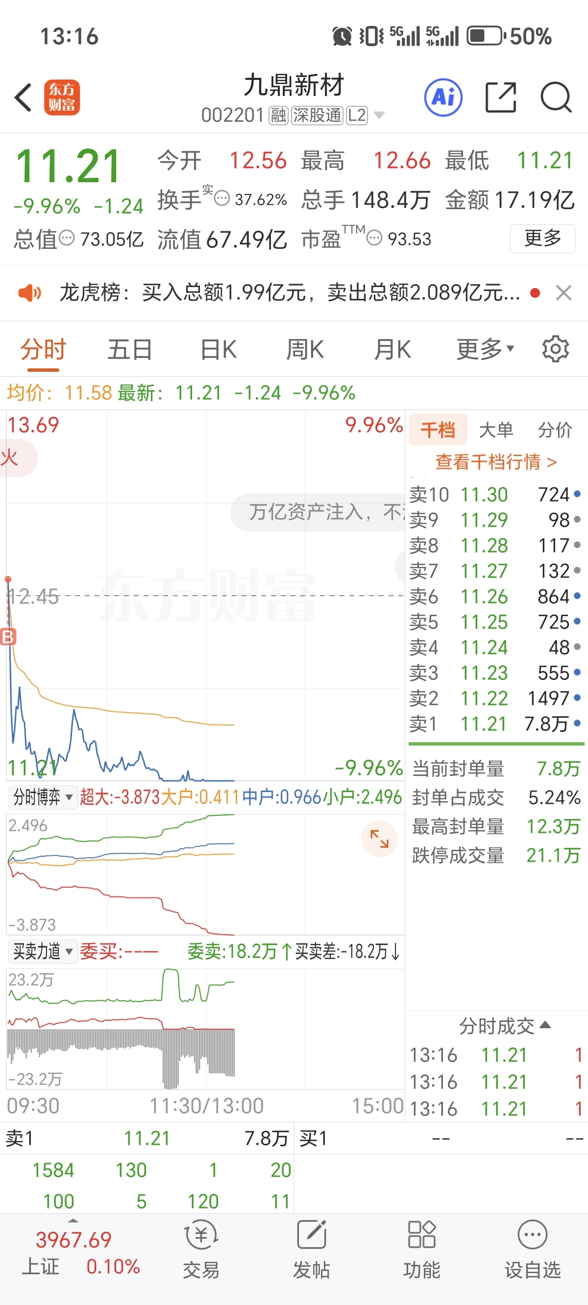 $九鼎新材(SZ002201)$ 感觉主力就像埋伏我一样,上周看放巨量我今天准备的是高开不接,低开跌停也不接,平盘左右就接,接进去就是一个板