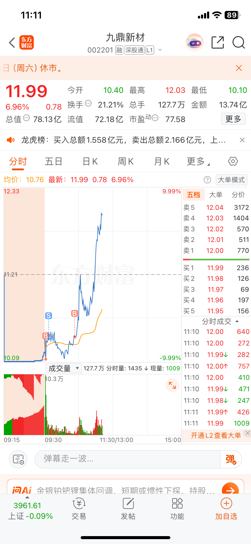 $九鼎新材(SZ002201)$ 能涨停吗?