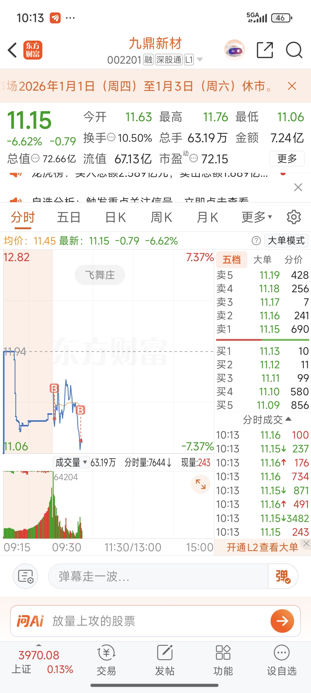 $九鼎新材(SZ002201)$ 今天就这样了,收摊!