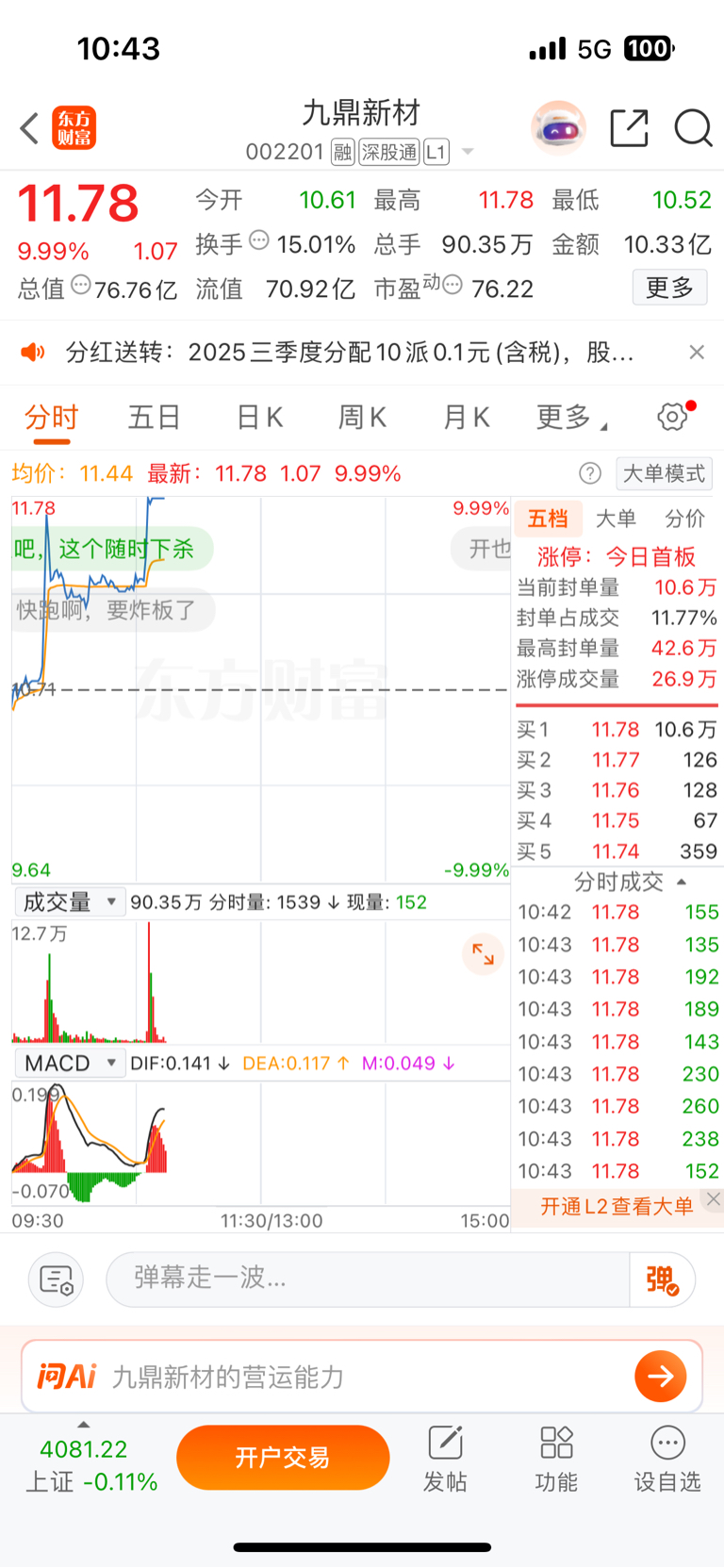$九鼎新材(SZ002201)$ 板上成交了将近4个亿,刚封板时我就截图了