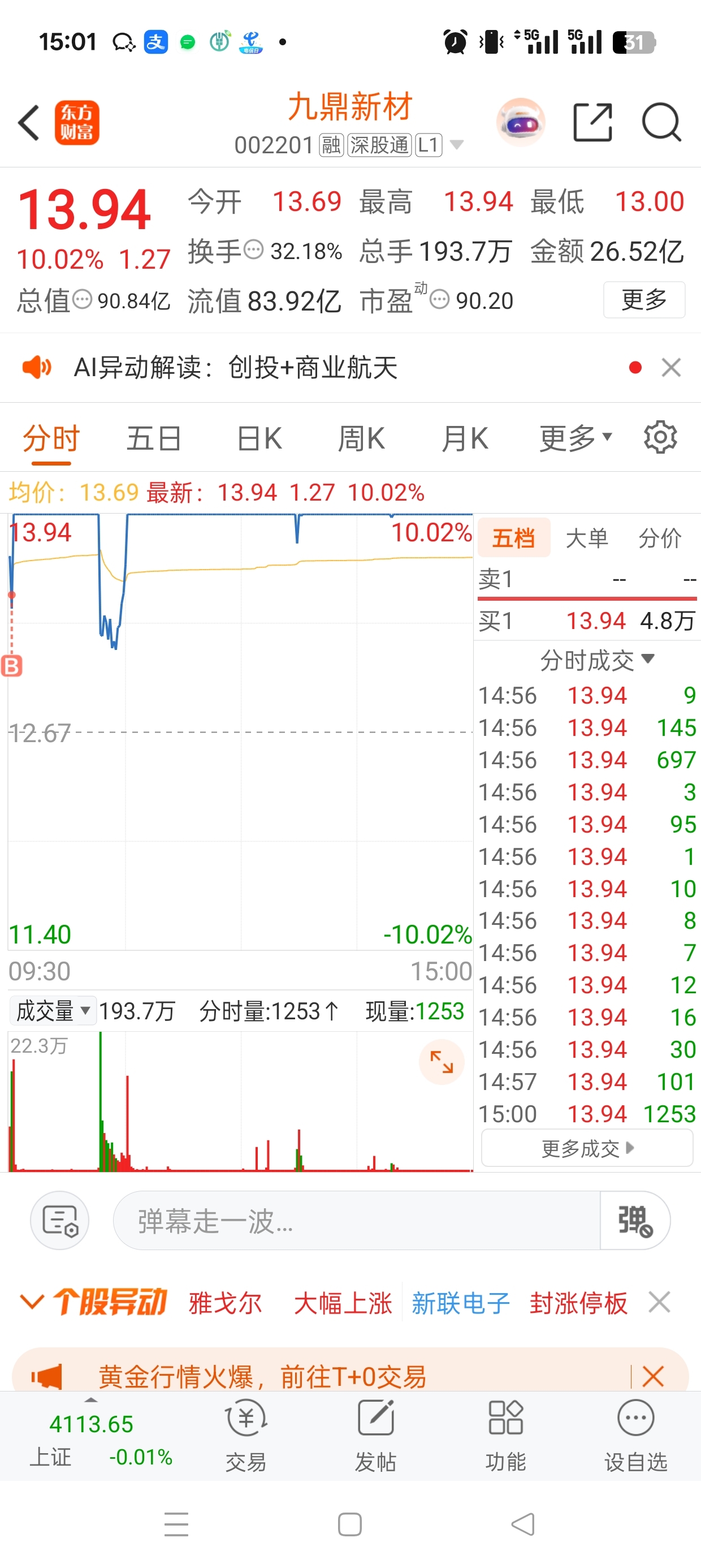 $九鼎新材(SZ002201)$ 今天航天板块太拉胯了,幸好封住了,明天航天板块回流,晋级三板