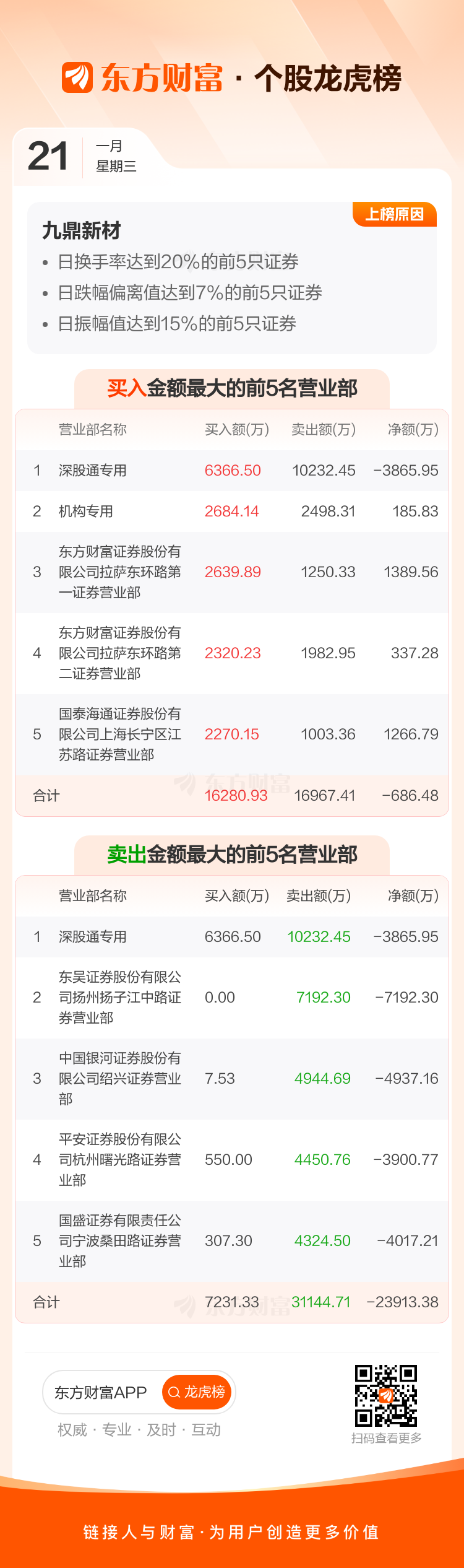 交易所2026年1月21日公布的交易公开信息显示,九鼎新材因成为日换手率达到20%的前5只证券、日跌幅偏离值达到7%的前5只证券、日振幅值达到15%的前5只证券上榜。九鼎新材当日收报12.6元,涨跌幅-9.61%,偏离值34.08%,换手率34.08%,成交额27.53亿。